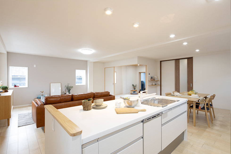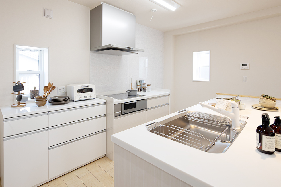 【キッチン】キッチンはアイランド型にすることで、視野が広がり、家事をしながら子どもを見まもれる空間に。