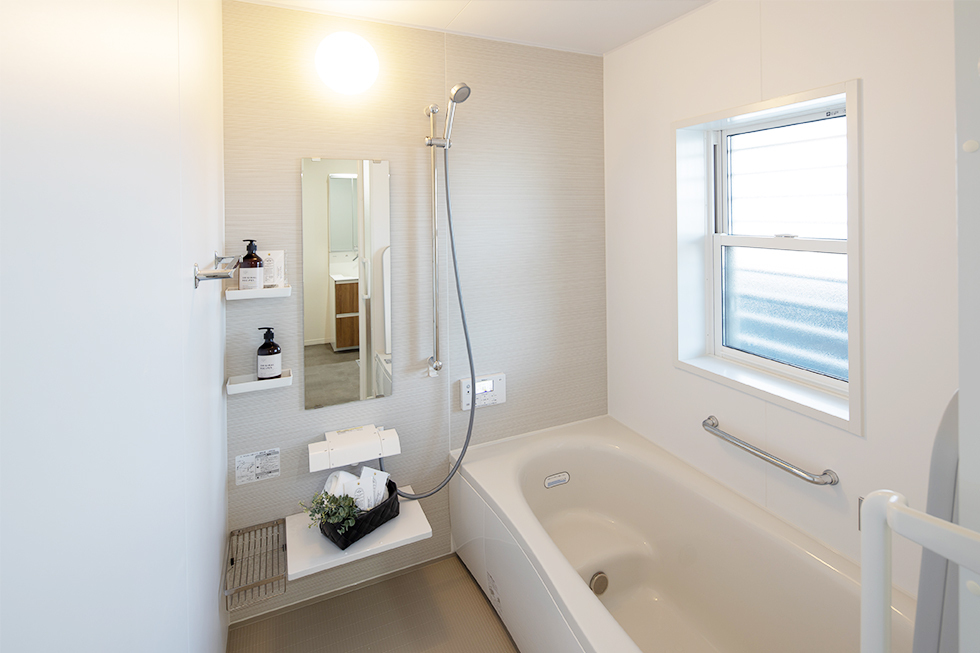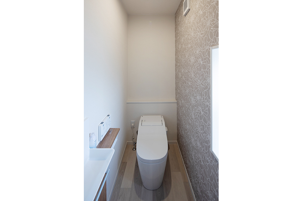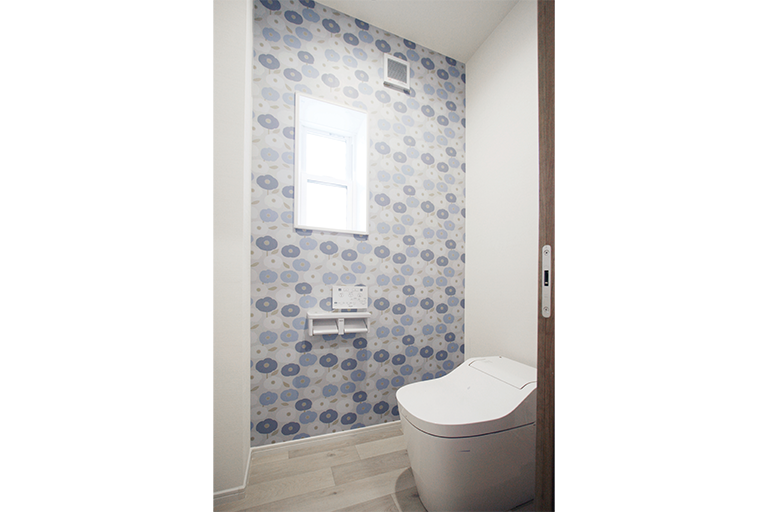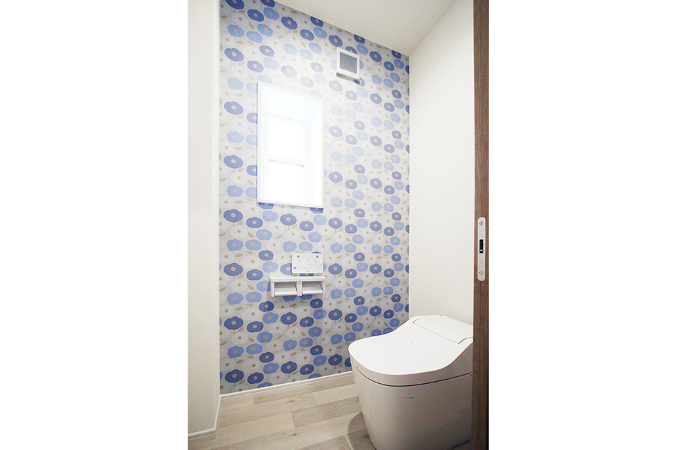 【1階トイレ】プライベートスペースなので、ほっこりとする花柄の壁紙を採用。窓を設置し、昼間はライトを付けなくも明るい空間に。
