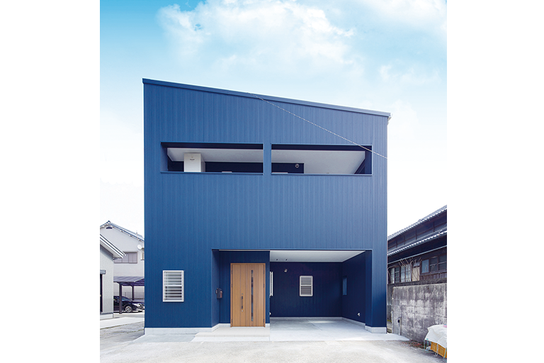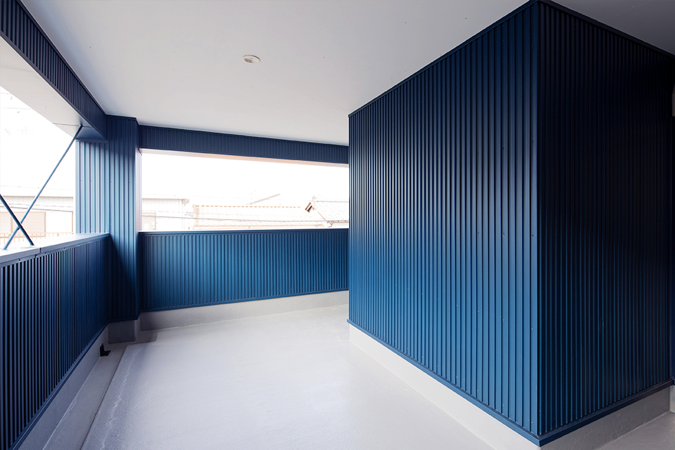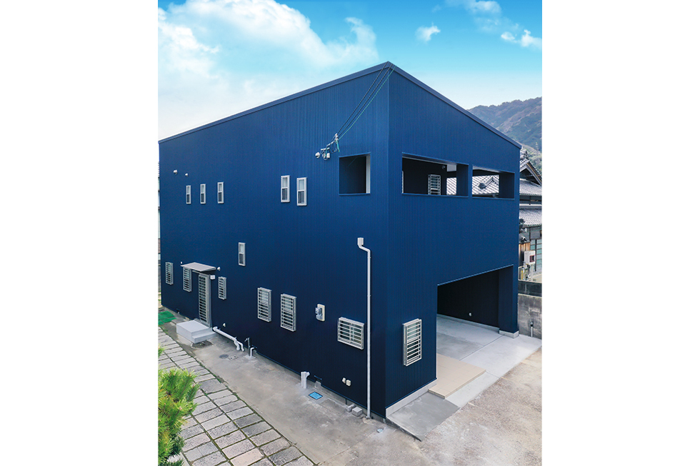 【外壁】会社の面影がないくらいにイメージチェンジ。紺色でまとめ、縦ストライプが建物の存在感をより高く大きく見せています。