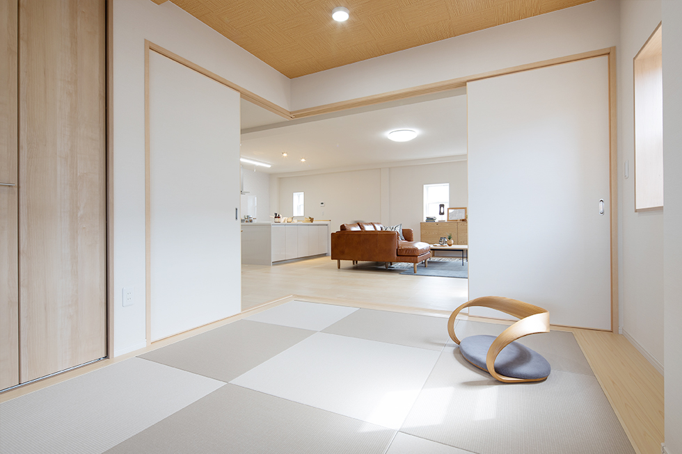 【和室】普段は和室との引戸を開放してリビングと一体に、引戸を閉めるとプライベート空間になり、奥さまの楽器演奏の練習場にしています。