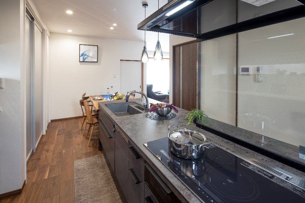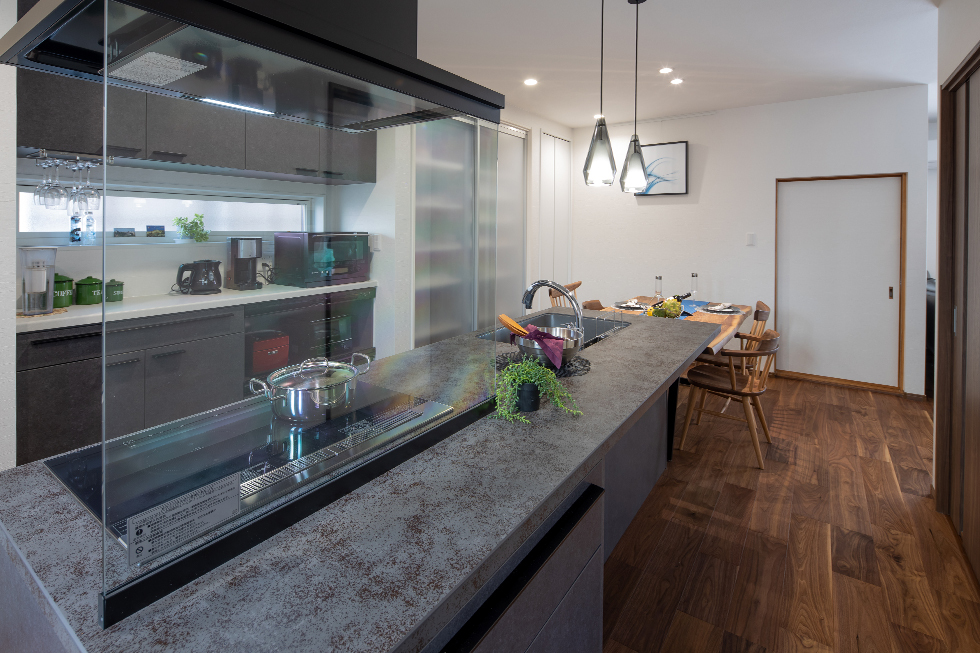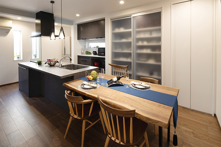 【ダイニングキッチン】キッチンはアイランドキッチン型。限られたスペースを有効活用し、スペースに合わせたオリジナルの食器収納をオーダーメイド。こだわり抜いたキッチンは母娘で使い勝手が抜群だと。