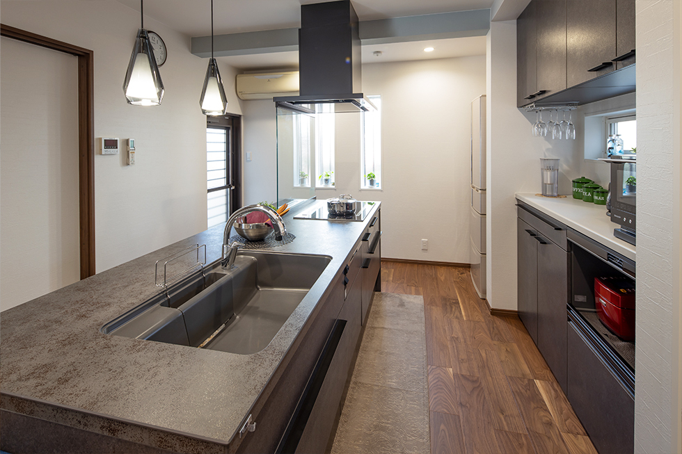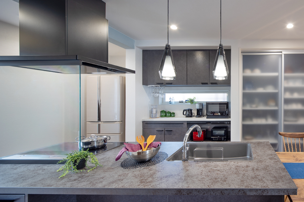 【ダイニングキッチン】アイランドキッチンには、ペンダント照明をご提案。開放感のあるキッチン空間のアクセントになり大のお気に入りに。