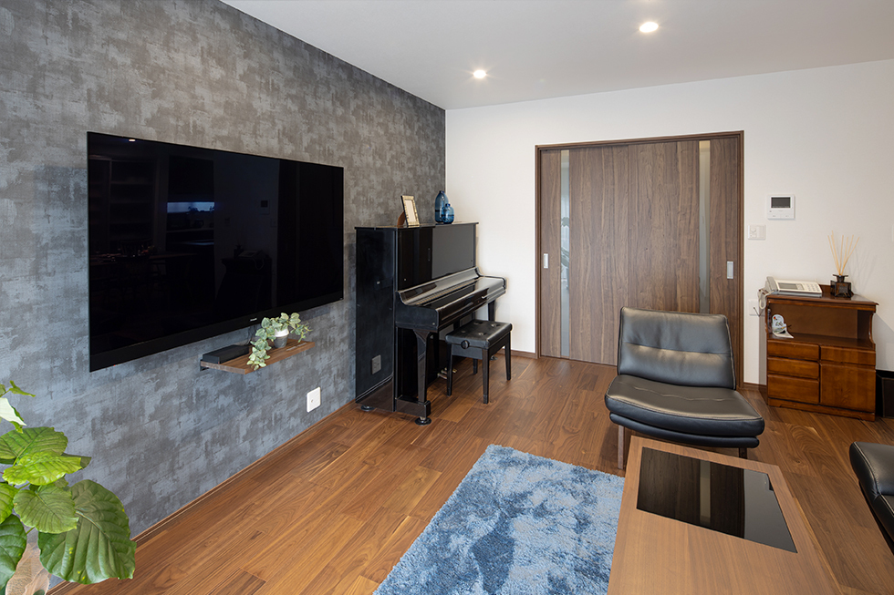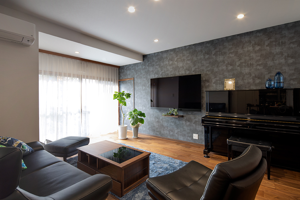 【ダイニングキッチン】掃き出し窓から明るい光が入るリビングは、壁一面に光の反射を抑えるダーク色を提案。テレビの位置はご要望にお応えし、スマートな壁掛けに。インテリアはシックで落ち着いたトーンに。