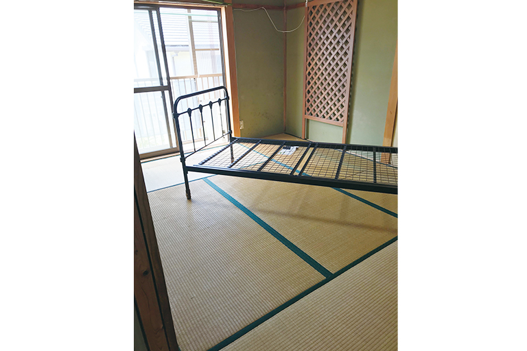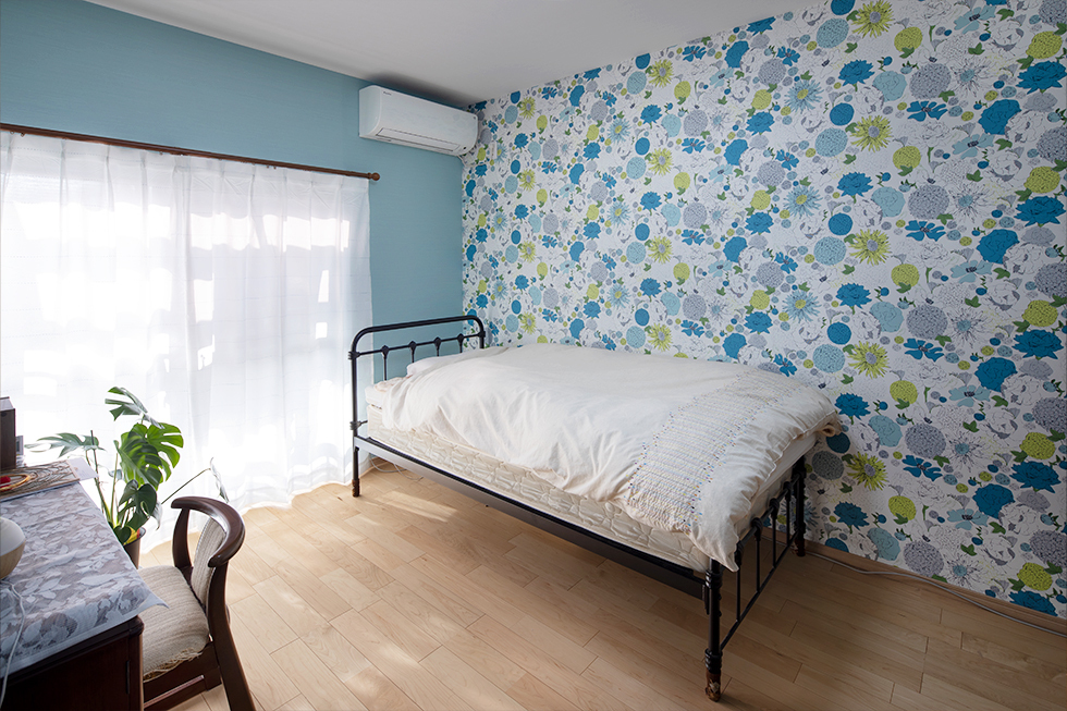 【寝室】和室から洋室へリニューアルした2階の一室は、娘さまのお部屋に。大胆な柄のクロスとミントグリーンのクロスは、まるでヨーロッパの寝室のよう。