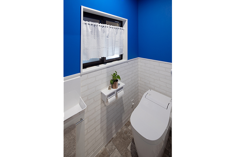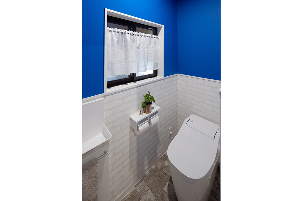 【トイレ】ご主人こだわりのトイレ。かつて奥さまとご旅行した南欧の思い出の碧い海と空をイメージしたクロスに。白いレンガ調のクロスでよりブルーを引き立たせています。