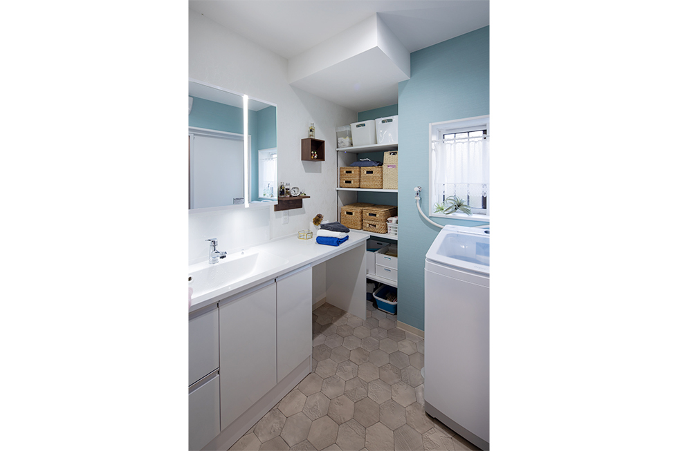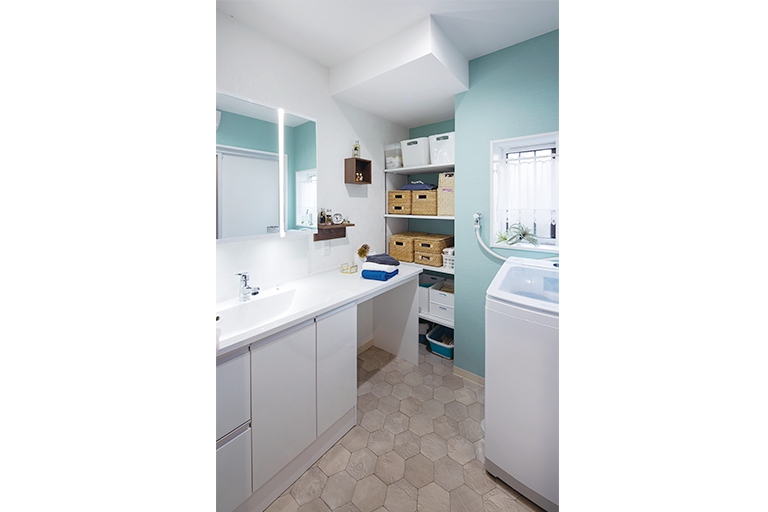 【洗面化粧室】朝混み合っても利用できるようカウンターを設置。デッドスペースにも可動式の棚を設け、タオルや洗剤のストックを収納できるように。