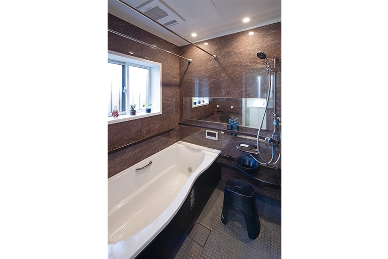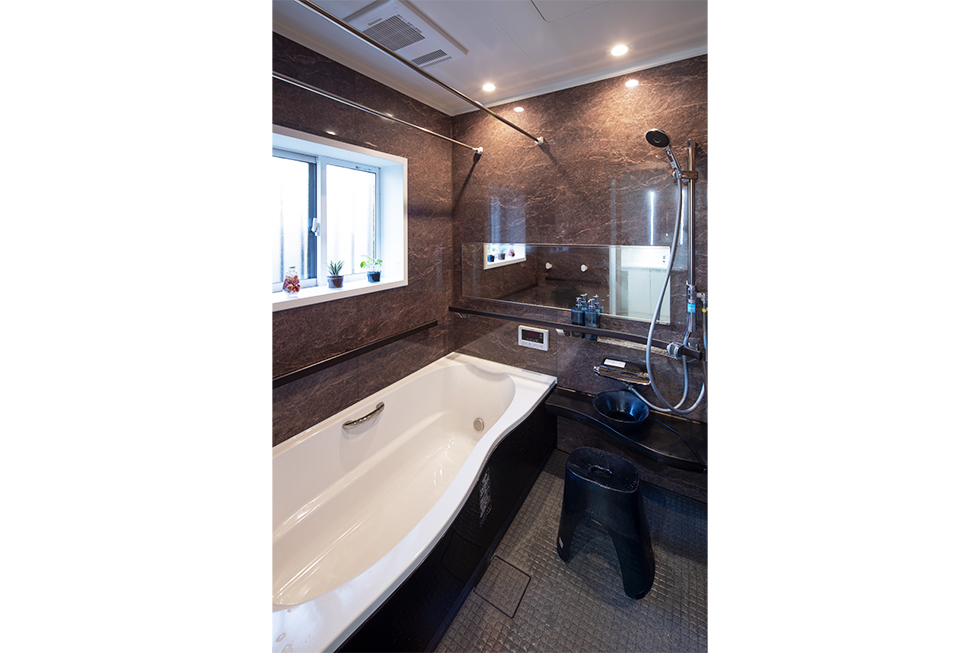 【お風呂】ご主人のご要望でお手入れしやすい人造大理石の浴槽チョイス。浴室は全面にダークブラウンを使用し、ホテルのようなお風呂に。