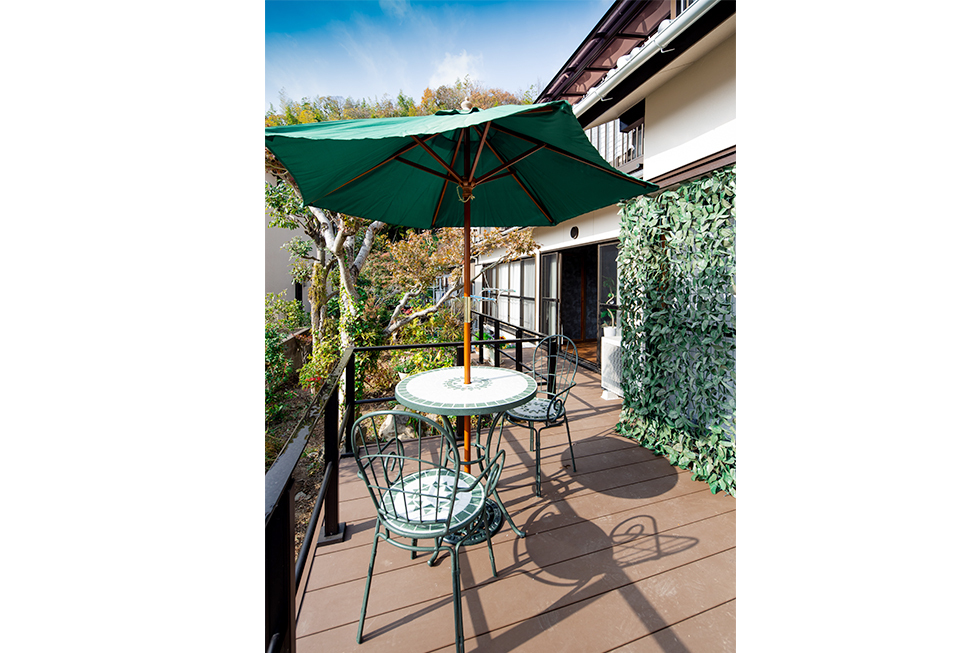 【ウッドデッキ】古い物置を撤去した場所に、リビングから続くウッドデッキを設置。暖かい日にはピクニック気分でランチやコーヒーを飲み、ゆっくりとしたひとときを過ごすことが今後の楽しみになったと。